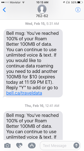 And switched I did. At our house we have our home phone, our Internet and our TV with Bell. My daughter had Bell Mobility at the time (she’s moved abroad now so she canceled that number). I had been to a Bell store near our house where a young sales/customer service rep was very knowledgeable and friendly when I asked questions before (even if I didn’t buy anything). So I went to see her and asked for the switch. I had heard about ROAM BETTER before and assumed it would be exactly like Rogers (telecoms being the fierce competitors that they are). That was Big Mistake No. 2 – not doing my research thoroughly. I did get a great plan for Canada – unlimited text, voice and 7 Gigs of data. So when I’m in Canada the plan is excellent. But leaving Canada?